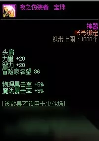 DNF夜之伪装者宝珠的属性是增加20点力量、20点智力、86点冒险家名望、5%的物理暴击率和5%的魔法暴击率,附魔的部位是头肩。获得方法是通关启示之夜副本时几率掉落获得,也可以在NPC德鲁伊·弥雅的商店中使用启示碎片兑换获得。