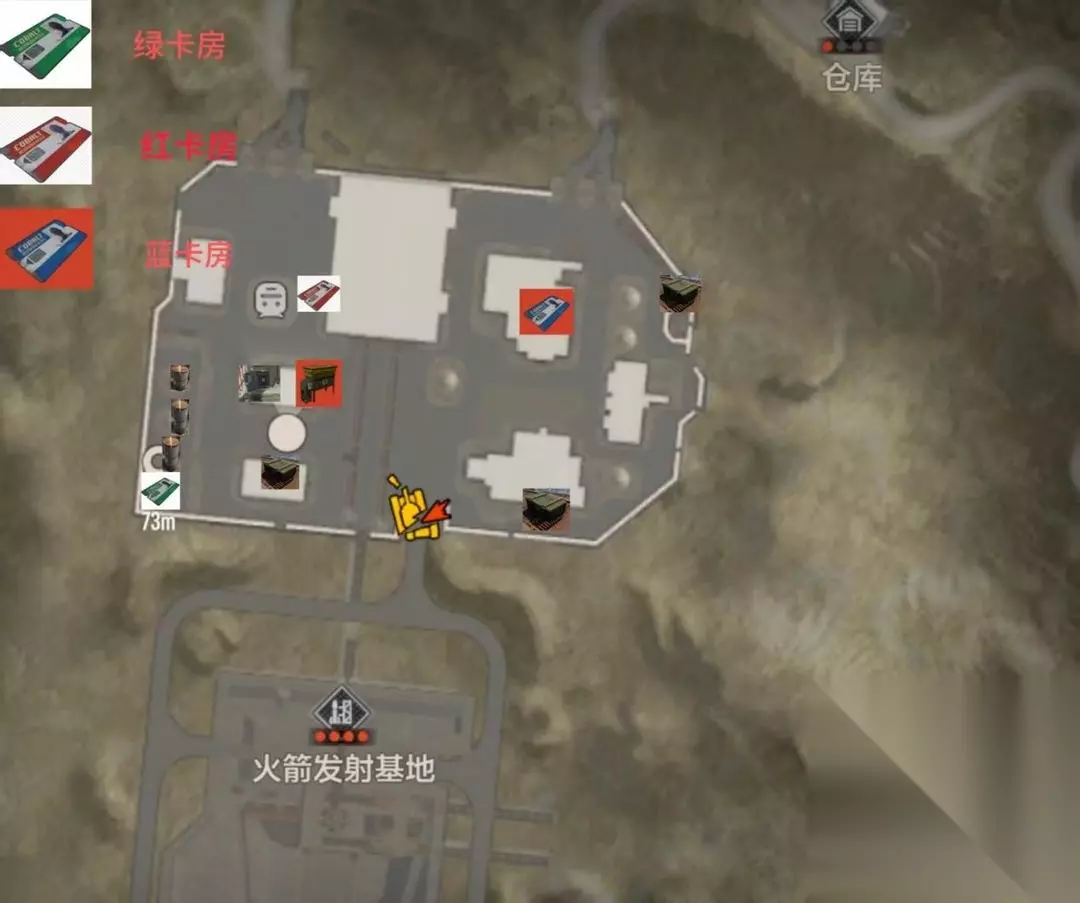前期准备 -装备物资:携带足量的药品,准备好枪支、弹药、医疗用品。建议穿小黄衣进红卡房 -卡片携带:提前准备好绿、蓝、红三张卡,四星点位不刷新这些卡片。 基地探索攻略 -清理坦克及小兵:到达火箭发射基地后,先利用地形和火箭筒击败巡逻坦克,坦克被击毁后会刷新5-6个小兵,采用游击战术清理小兵,等待坦克燃烧结束后拾取物资。(不打可以绕开去捡资源) -绿卡房:找到基地内并立在一起的三个大罐子,其左边是绿卡房。进入旁边的废弃仓库,左拐弯后在墙壁上找到绿卡的保险丝,将红、绿电路分别连接到最左和最右,即可前往绿卡房,收获储物物资。(并在绿卡房中连接好电路盒)