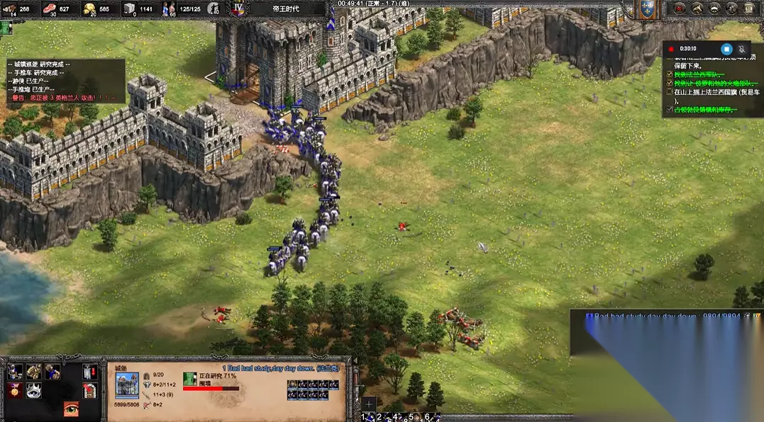具体的迂回与清理步骤需要精细操作,在派遣冠军剑士前往紫色南方基地的同时,应妥善运用开局配属的远程部队与攻城器械。利用投石机清理地图中央隔离区域的树木,可以开辟出一条通往黄色势力基地的隐秘路径,此举的目的是为了在触发主要敌人进攻事件前,先行解决掉相对孤立且部队会逐个前来送死的黄色势力。清理黄色势力后,其基地内的资源与建筑可为己方所用,获得一个相对安全的发展区域,但需注意不要过早攻击紫色城市的主体部分。