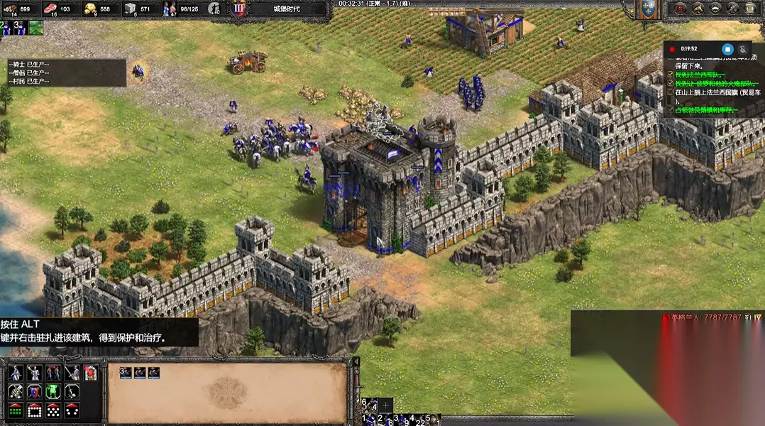 发展阶段的关键在于利用游戏机制的特定设定来确保安全,只要不主动摧毁勃艮第势力即紫色的城镇中心,作为主要威胁的英格兰红色势力就不会被触发主动进攻。这为玩家提供了一个至关重要的战略缓冲期,玩家应在此阶段将村民转移到已控制的黄色城市区域内或地图其他安全位置,专注进行经济发展与军事升级,积攒足够的资源和组建一支包含高阶兵种与攻城武器的强大军队,为最终决战做好准备。