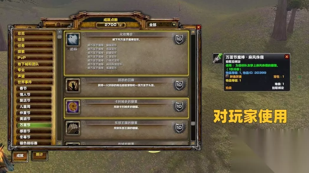 第五个成就是《摸摸你的头》,玩家打开糖果包的时候有几率获得沉重的南瓜灯,直接扔给所有种族就可以了。如果是单边服的话,可以去战场完成。如果有2个账号的话,则可以自己建立对方阵营小号来完成。 第六个成就是《侏儒美味营养糖之怒》,需要玩家在使用侏儒美味营养糖的情况下获得50个荣誉击杀。侏儒美味营养糖可以在旅店的糖果包中开出来,吃了之后去打战场就可以了。