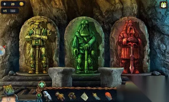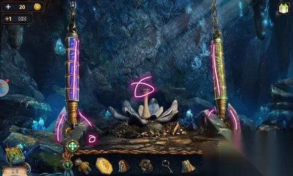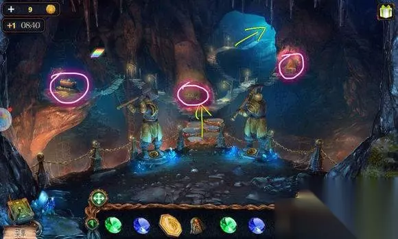 森林场景【船】 木桶——用螺丝起子——残图——放麻袋——炸药 森林场景【船上房间】 书——放残图——拼图——看到雕像图 地心场景【两雕像】 1、两雕像——按图调整雕像姿态——可以到对面 2、左边山洞——点滑移动物体——钥匙 3、中间山洞——配对游戏——蓝宝石 4、右边山洞——人首雕像 地心场景【电梯】 1、地上——绿宝石、扫帚、角 地心场景【钟乳石】 1、水里石像——安角——蓝宝石,可以到对岸 2、对岸——左边柱下——宝石 3、对岸柱子——安宝石——按顺序点击符号(火雕像场景地上红布)——升起石柱——绿色盘 森林场景【右边树屋】 1、床尾盒子——安色盘(金绿红紫)——完成色盘调整——溶剂、海星雕塑