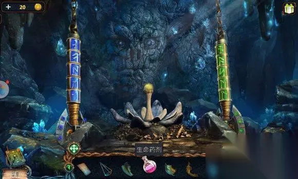 城堡场景【塔楼大厅房间】 桌上——放配方,龙血、铜粉、蛇衣、珍珠、生命石、月光泪——按配方制作——蓝色粉末 地心场景【活雕像】 活雕像——用蓝色粉末——完成游戏