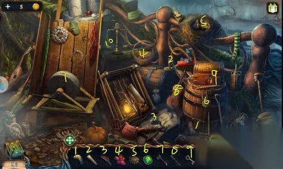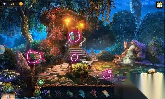 森林场景【路口】 1、灯杆——匕首 2、吊桥——树枝 3、石头——用树枝——猫头鹰 森林场景【路口左边大树】 1、地上——砝码① 2、树枝——用猫头鹰——门环 森林场景【路口】 右边树屋大门——安门环——敲门——进树屋 森林场景【右边树屋】 1、桌上——砝码② 2、床下——油 3、轮子旁——捕网 4、地毯下——红色图章① 5、围幔——寻物游戏——龙首 森林场景【路口左边大树】 大门——安龙首——调整龙首位置,开启树屋 森林场景【右边树屋】 讲台下——砝码③ 森林场景【路口】 吊桥桥口——放砝码——修好吊桥,通往下一场景河边 森林场景【船岸】 1、水里——绿草丛 森林场景【河边】 1、枯树——树皮 2、岸边花——用刀——根须 3、岸边花——用捕网——萤火虫 4、水里荷花——用刀——紫菊 森林场景【路口】 1、灯笼——放萤火虫——灯杆下,配对游戏——羊角锤 森林场景【河边】 船——用羊角锤——桨 森林场景【船岸】 1、鸟笼——用桨——空瓶、星座图 2、大树——用刀——蘑菇 3、大树——用刀、空瓶——树脂 森林场景【右边树屋】 桌上——放绿草丛、树皮、根须、蘑菇、紫菊、树脂——按配方制作,蓝色百合 森林场景【河边】 1、水里荷叶——放蓝色百合——水里河神出现 2、枯树旁——箭绳 3、船上盒子——小游戏,完成——红色图章②、弩——安箭绳——弩 森林场景【船岸】 船,旋梯——用弩——开启船场景