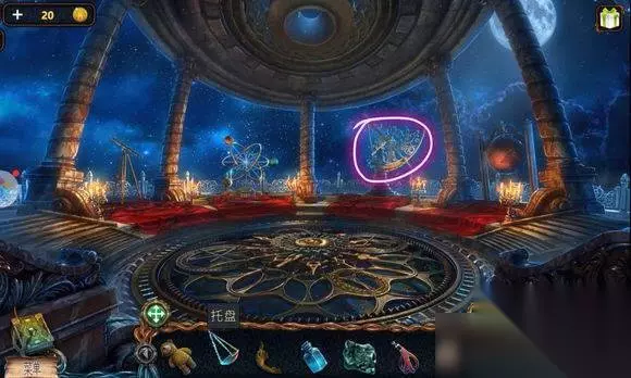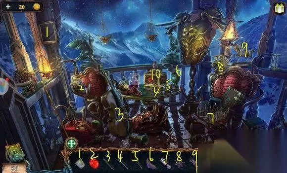 城堡场景【塔楼花园】 1、池边——水晶碎片 2、水里,蛤蜊——用刀——珍珠 3、水里——用烧杯——烧瓶 4、台阶——龙纹碎片⑨ 5、花丛——选7个花朵,镜片 6、亭子——寻物游戏——托盘 城堡场景【塔楼大厅房间】 壁炉台——放浆果、乌头、树根、花朵、花蜜,用刀——按配方制作——生命药剂 城堡场景【塔头植物间】 1、藤蔓处——放水晶碎片——完成碎片调整——长笛、龙纹碎片⑩ 2、树——用长笛,赶走蛇——蛇衣、铜粉 地心场景【钟乳石】 对岸,山神——用生命药剂——生命石 城堡场景【大厅】 墙上——安龙纹碎片(10片)——龙血 城堡场景【塔楼天台】 天平座——放托盘、镜片、铜钱——按塔楼大厅桌上图示调整透镜位置(移动铜钱)——放烧瓶——月神泪