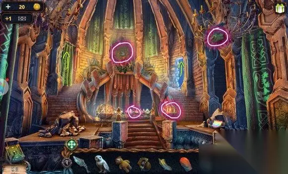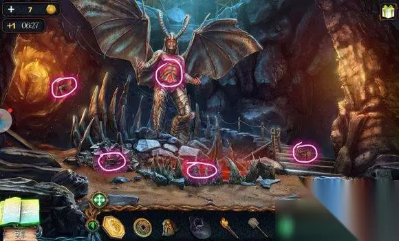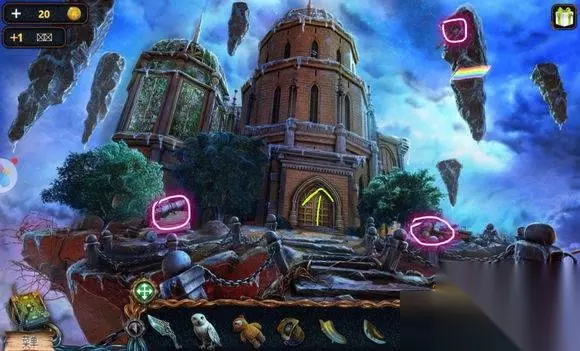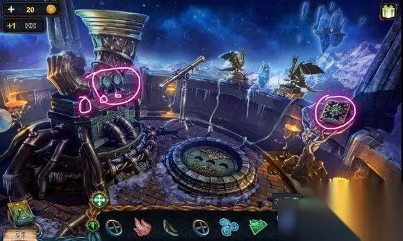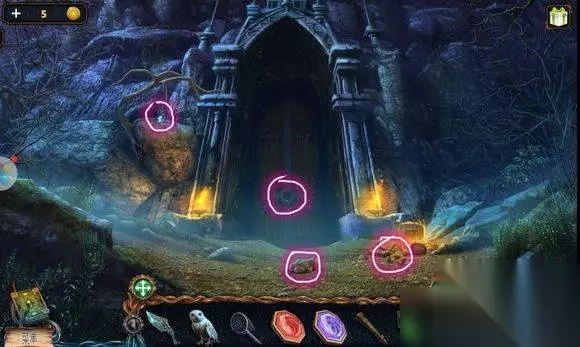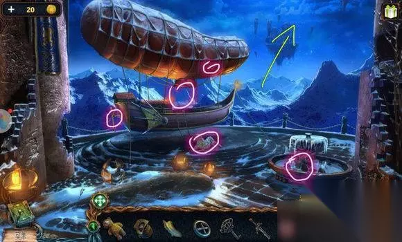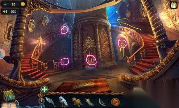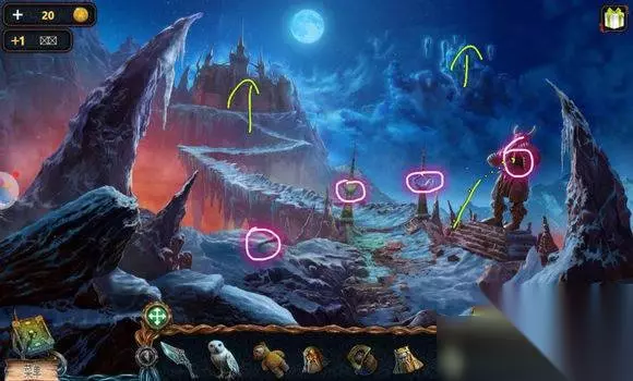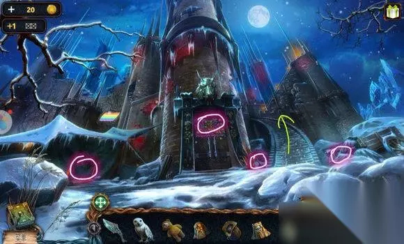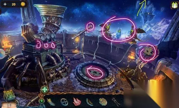 城堡场景【塔楼大门】 1、炮——符文图章① 2、右边石头——木锤、炮弹、木轮(用木锤) 3、悬石——用猫头鹰——压杆 4、炮——安轮子,用木锤 5、炮——放炸药、放炮弹,用压杆 6、点击炮,轰开塔楼大门 城堡场景【塔楼大厅】 1、桌——龙纹碎片④、符文图章②,看月球天平图 城堡场景【塔楼,天台】 星球座——龙纹碎片⑤、符文图章③ 城堡场景【天台】 1、地上——放符文图章——连接管道 2、两条龙——调整位置,让气流方向对着猫头鹰——猫头鹰浮雕 城堡场景【山前】 1、右边柱子——放猫头鹰浮雕——记住两个柱子上图案 城堡场景【塔楼大厅】 门——用两个猫头鹰浮雕图案解码——打开房间大门