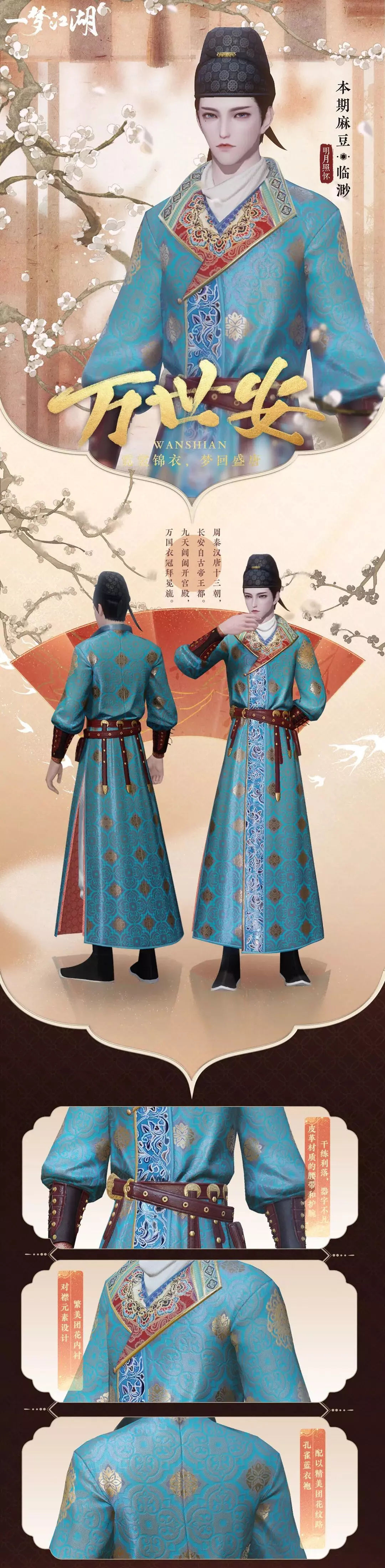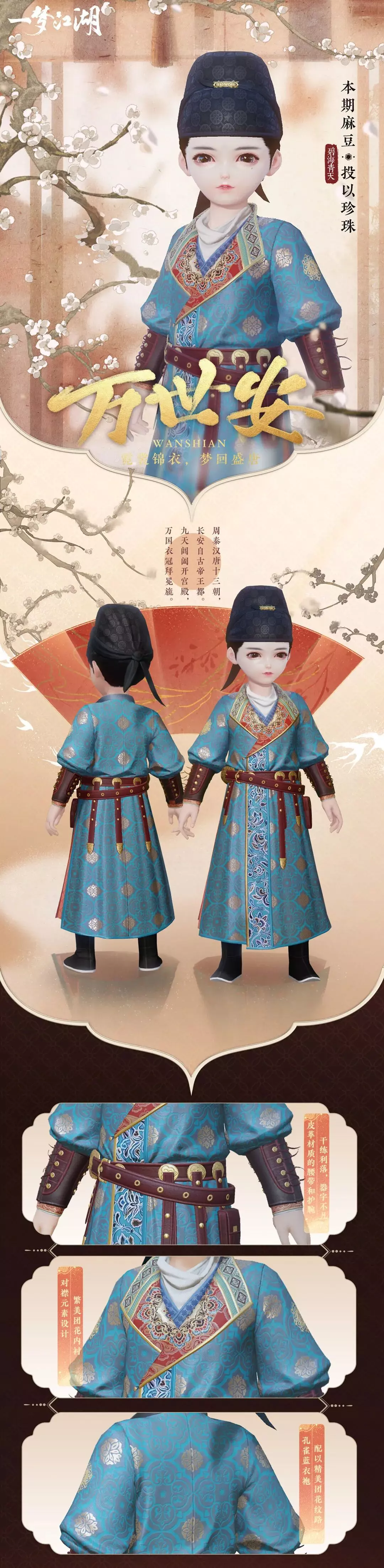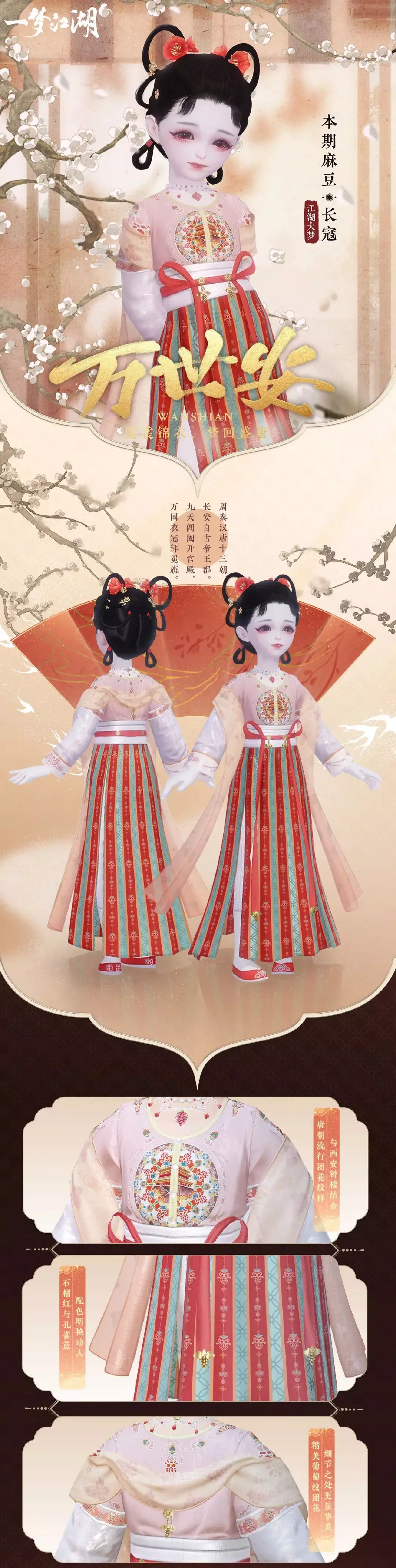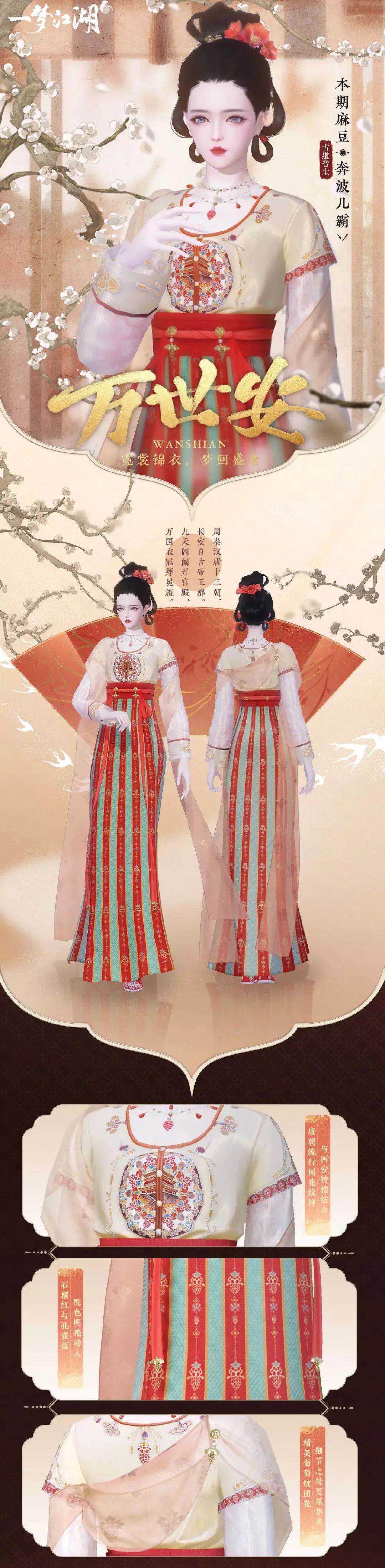 近日云锦楼的小师傅游历长安,见长安城内飞檐翘角花红柳绿,冰雪消融百芳争艳。便依据长安楼阁为元素,取市花“石榴花”为点缀设计出时装“万世安”,各路游人一时传出“不着长安锦,不曾游长安”的说法。