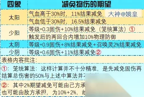 3、太阳 气血低于30%时,增加触发的几率,较适用于容易被集火的单位,但是容易被集火的单位如果是少阳触发后两回合内增加来自其它物理单位的抗性,也是更好的。 4、少阴 少阴和太阳一样,触发时抵挡的比例较高,同时又有稳定的固伤减免,至于其他单位承担伤害也未必就一定是增益。 减少物伤期望: