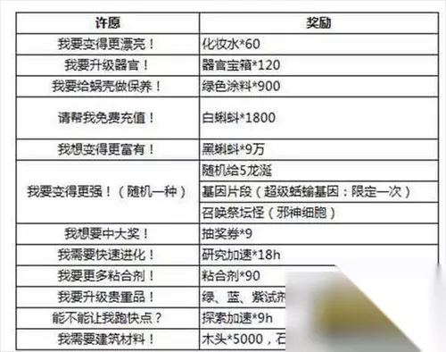 1.我不想当蜗牛了! 蜗牛壳:皇帝的新衣 2.我要见游戏管理员! 蜗牛壳:GM文化衫 3.我要更多异性伙伴! 未知魔法药水,可以让伙伴朴巨汉变为女性,并获得朴巨汉的胸毛做为第27号移植器官。 4.你走!我啥都不缺! 绿色贵重品:神龙雷达,升满后可以每个龙珠加速9%(约4小时左右,养成游戏时间就是资源,建议能拿趁早) 5.我…我想打篮球! 绿色贵重品:湘北篮球 6.给我点好吃的! 绿色贵重品【变异土豆、变异豌豆、变异玉米、邪神细胞残骸】中之一。 7.我要最凶残的装备! 绿色贵重品【杰克手套、汉尼拔解剖刀】、蓝色贵重品【杰森面具】或击败伽椰子获得【伽椰子的护肤】中之一。 以上是小编为各位带来的全部内容,更多精彩游戏资讯,请持续关注。