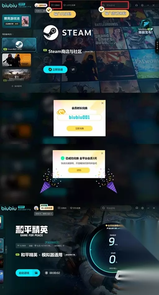 领取福利的步骤也非常简单:打开biubiu加速器,搜索《和平精英》PC模拟器并选择“自动匹配最优节点”即可为游戏提供加速服务。在个人中心找到兑换码入口,复制小编提供的兑换码,即可获得免费加速时间,操作省时省力。