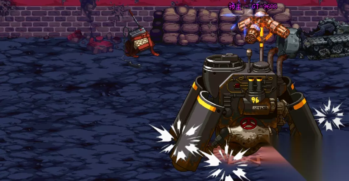 (6)UM-0 终结者 机制讲解: 攻击1,近战一段攻击; 攻击2,蓄力大范围攻击,终结者分出两个残影后一同突进; 攻击3,近战范围攻击,终结者引导放电,对周围敌人造成伤害; 攻击4,投掷大量定时炸弹,倒计时后爆炸。 打法讲解:终结者的攻击手段并不多,但房间里还设有若干治疗设施和一个发电机,其中发电机会周期性的充能并使用雷击攻击玩家。随意,在挑战这个BOSS时务必优先摧毁周围一切设施,成功后难度会大大下降。