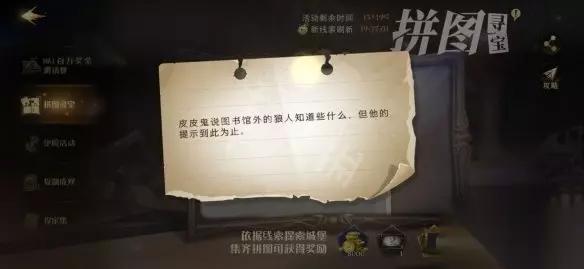 皮皮鬼说图书馆外的狼人知道些什么,但他的提示到此为止 拼图线索:皮皮鬼说图书馆外的狼人知道些什么,但他的提示到此为止。