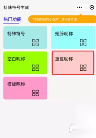 三、如果是想生成纯隐形符号昵称,则点击“空白昵称”,如果是想用的昵称已重复,想要添加几个隐藏符号,就点击“重复昵称”,这里演示重复昵称(和空白昵称操作方法基本一致)。