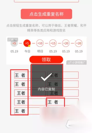 五、如下图,这时下方会生成十个添加了隐形符号的昵称,这些隐形符号在王者荣耀游戏中也是空白隐形的,这时挑选一个满意的昵称,点击即可复制。