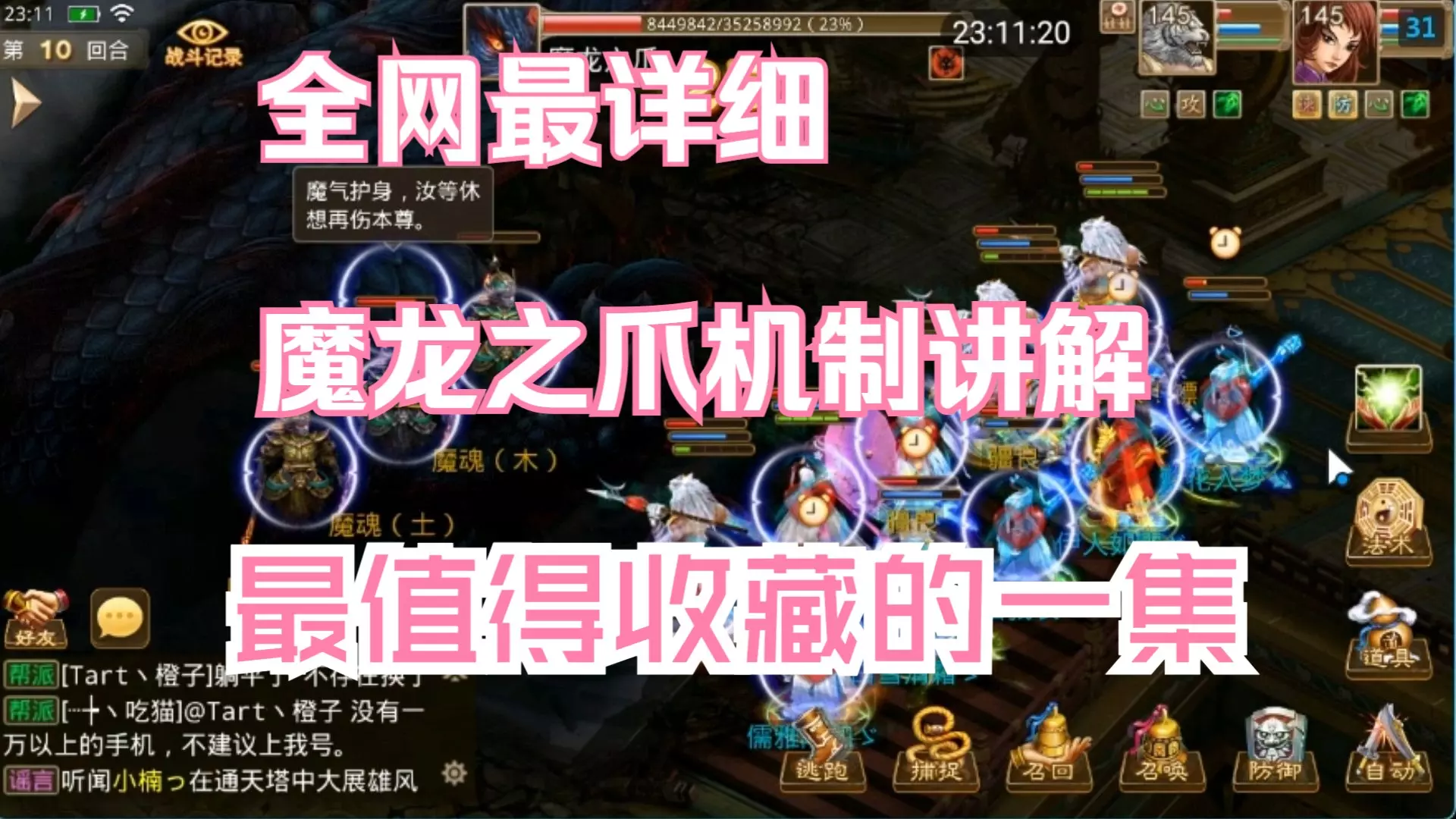 这是《问道手游》的魔龙之爪挑战记录,玩家组队挑战魔龙之爪,战斗中魔魂会借助五行之力,玩家队伍在多回合战斗中与魔龙之爪及魔魂展开对战,本次是玩家首次记录该挑战过程。