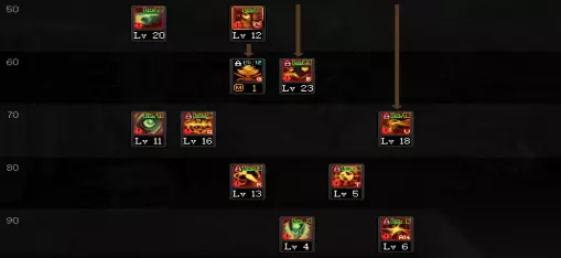 接下来是50级至90级的技能加点: 这里就是大技能和被动技能都点满就可以了,100级的三觉必点,然后在这里小编建议绑定一觉,原因是一觉比二觉的数据低很多、和三觉同样都是可以偷跑的技能会产生一点冲突,不过绑定一觉也丝毫不影响变身。