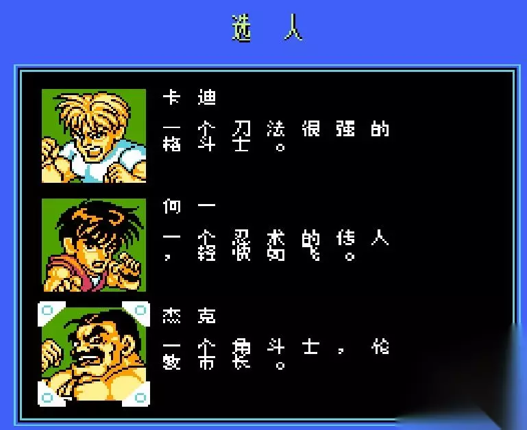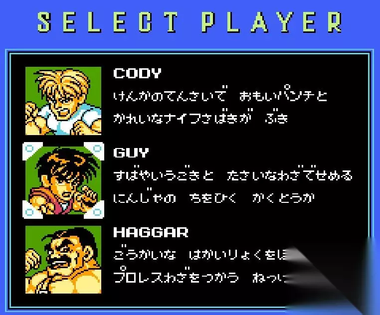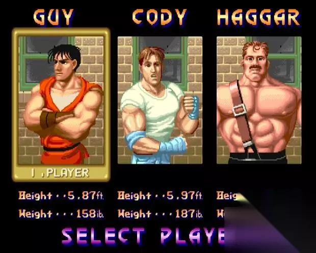 Cody(科迪):打架天才,速度力量适中,使用武器为匕首。连套的散打是很实用的招数,还有很强的波动拳和升龙拳的技能,尤其是波动拳,可以对很多BOSS起到作用,初级者适用。 Guy(凯):忍者后裔,动作敏捷,速度快,,使用武器为手里剑。力量虽然不强,但灵活的动作完全可以弥补其不足之处。武神流穿心腿更是开始就可以使用万能的技能,基本可以对付所有敌人。 HAGGAR(哈格):职业摔跤手,攻击力强,使用大锤,高级者适用。行动速度和攻击出手的速度可以说是市长最大的弱点了,如果能够熟练使用,市长还是最强的,对付BOSS泰山压顶是最强有力的攻击。可以用飞扑将敌人抓住,再使用拿手的摔功。
