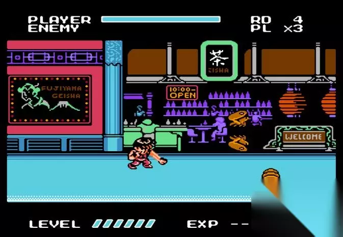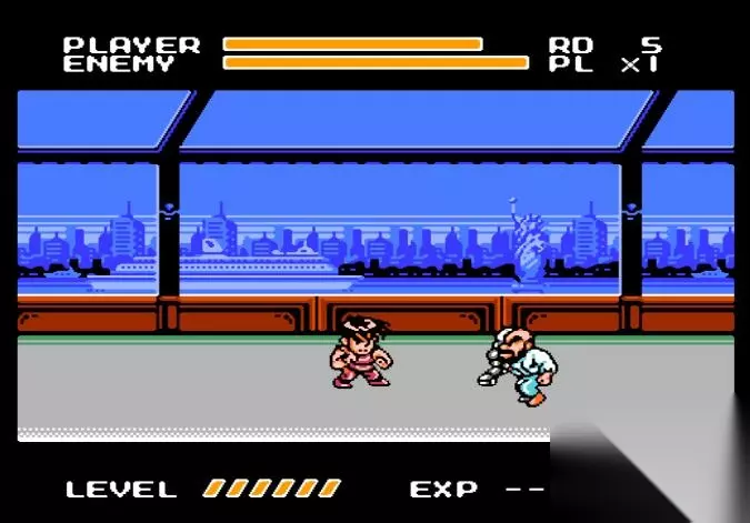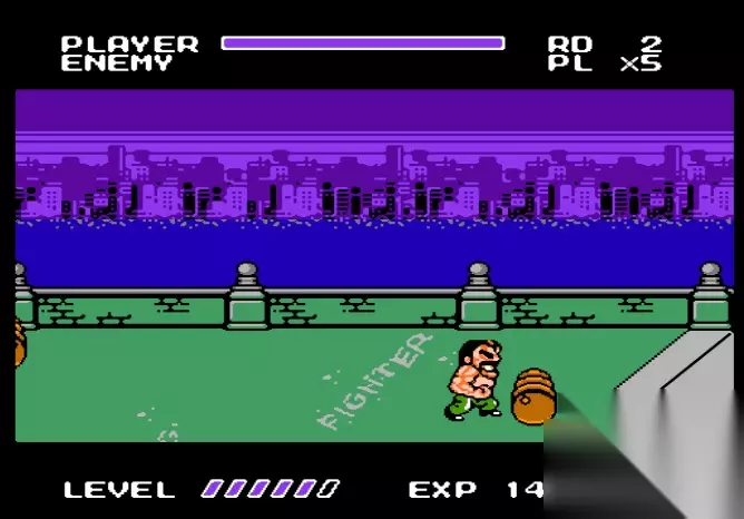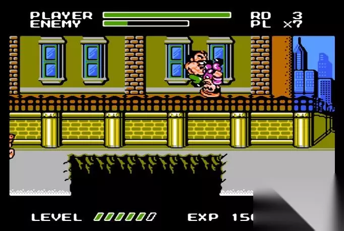 FC八位机受其本身性能所限,在移植街机游戏时画面往往变得惨不忍睹,于是MFF反其道而行之,直接把人物和场景变成Q版,大量减少模块的使用,使其适应八位机的性能。不得不说这是一个无比正确的决定,Q版的人物和道具在八位机上辨识度更高,没有那种低位移植时出现的多边形和锯边。更重要的是游戏的爽快程度并没有因此而削减,相反它表现得比原作更为优秀。 《快打旋风》的一代和二代众主角只有简单的拳脚、投摔和扣血必杀,通关过程显得十分单调,而MFF则首次在系列中引入升级和搓招必杀,每位主角都有一到两招不扣血的必杀技,除了凯的穿心腿外,其余均要升至4级后才可使用。升级不仅仅能习得新技能,体力值和杀伤力也随之增加,尤其是哈格市长,当他升满6级后,其破坏力为三人之最,两次擒击加打桩就能干掉一个体力值跟自己(6级)相当的敌人,即使是BOSS也挨不住三下,堪称“人间坦克”。 MFF的升级系统不同于一般的清版或RPG游戏那样,在击倒敌人后拿取固定的经验值,而是与击倒的方式挂钩。比如单纯以拳脚打倒对手只会得到1至2点的经验值,但如果以连击或投摔技打倒对手,则会得到4点的经验值,而连击加投摔的话可得6点的经验值;使用凯的连环腿击倒对手可得5点的经验值;使用哈格的打桩技能击倒对手更能得到最高8点的经验值,因此主角升级的快慢完全取决于玩家的游戏方式,这两个系统的引入无疑增加了通关时的乐趣,鼓励玩家多使用招式来取胜,而不是近乎机械式的拳脚打击。 受限于八位机的性能,MFF同屏出现的敌人不会超过两个,尽管敌人的狡猾程度不亚于原作,但不会形成恐怖的“围殴”,再加上主角们招式丰富,熟练的玩家一币通关根本不是问题。三位主角中我最喜欢也最常用的是哈格市长,他默认的级数为3级,再升一级就可以使用“飞擒”的技能。飞擒的特点是可以迅速“胸袭”并擒住对方,之后大大方方地施以连击,若附近有杂鱼干扰的话还能挟住对方走远一点再狂虐,然后使用打桩压向企图上来支援的杂鱼,一举两得,此招在对付大块头BOSS——ABIGAIL时也十分凑效,但使用时机要得当,免得被对方反擒。