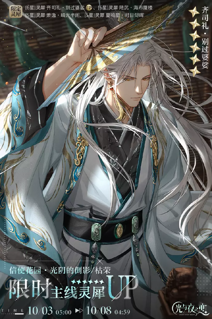 活动说明:在限定收信 [光阴的倒影・枯荣]中,[6星]灵犀 齐司礼・别过婆娑 限时加入卡池并获得概率UP。