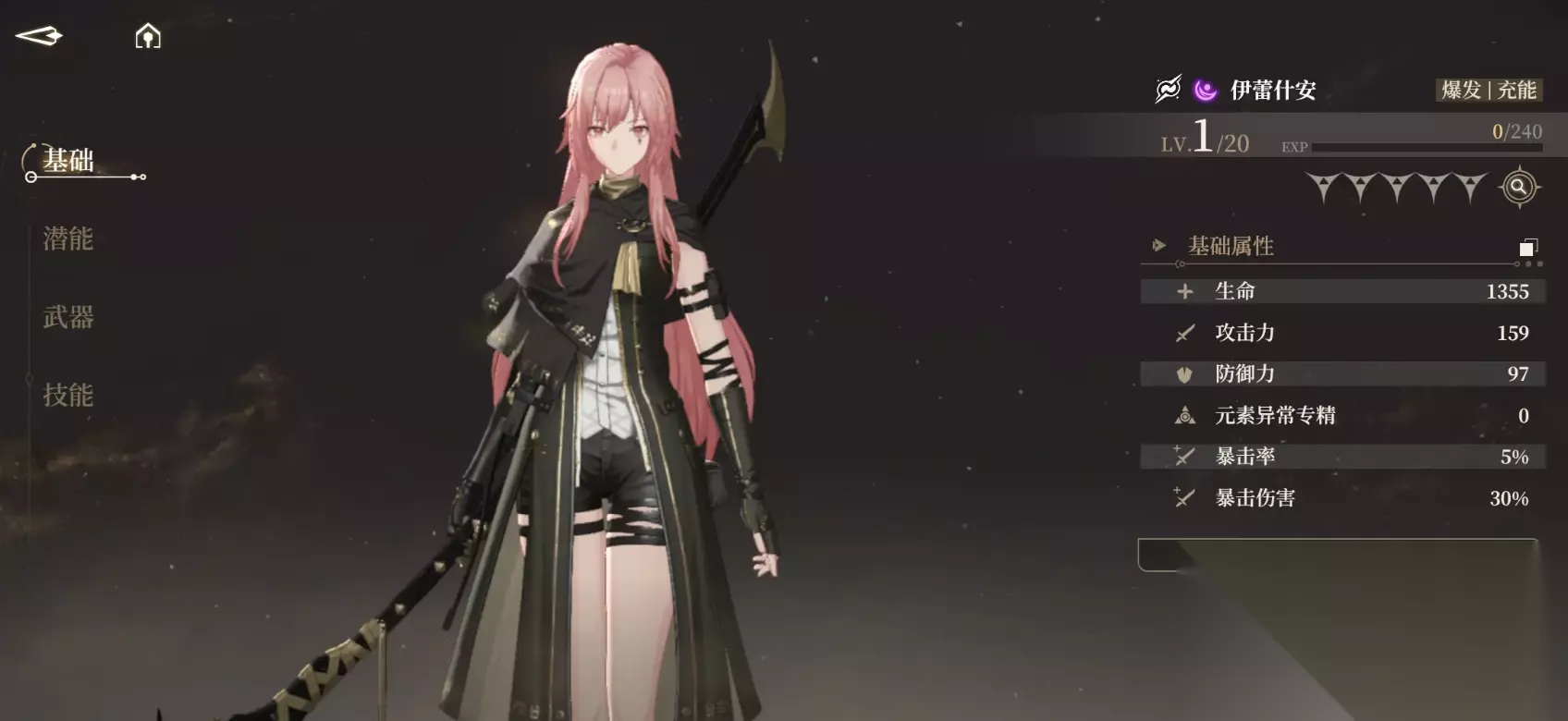4、伊蕾什安 她的被动是在使用技能二后会进入凋零收割状态,此时可以释放点击按键释放四次强力斩击,释放时会瞬身到敌人的身边,每次成功命中还会积累35点的幽影值,幽影值到100的时候点击按键能释放出一次高速连续斩击,造成充能输出;她的第一个技能会跳跃到空中丢出旋转的镰刀持续切割敌人造成追击伤害,期间再次点击按键会瞬身到镰刀位置,若其附近有敌人会发动强力斩击,并积累20点幽影值,若附近没有则返还消耗的精力值; 她的第二个技能会在幽影值到100时可释放,此时能对大范围敌人造成充能伤害,并对里面生命最高的施加印记10秒,后续对标记者造成的伤害将提升10%,她的大招会进行冲刺,并将最多4个敌人牵引到自己身边造成输出值。