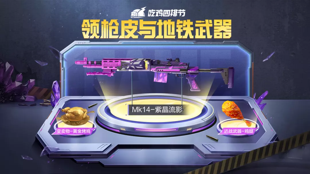 9月26日-10月9日,通过完成指定任务,获取开启奖池次数,累计开启10次必得变卖物-黄金烤鸡,累计开启20次必得Mk14-紫晶流影,完成全部任务,还可领取近战武器-鸡腿!