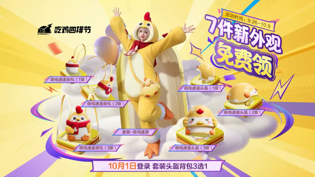 10月1日当天登录,还可直接在【萌鸡速递】系列套装、全套头盔、全套背包中任选一件哦~