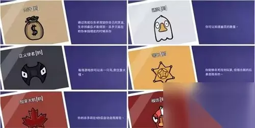忍者[鸭子] 技能:你可以同时杀死在范围内的两只鸟,但你的杀戮冷却时间是三倍,在禁区时冷却时间恢复得更快。 承办丧葬者[鸭子] 技能:你可以用较慢的速度来拖动尸体。 隐形[鸭子] 技能:你可以隐形5秒。 连环杀手[鸭子] 技能:杀死你的目标会减少你的冷却时间,相反杀死其他人会增加 食鸟鸭[鸭子] 技能:每场游戏你可以吃一具尸体。 变形[鸭子] 技能:你可以变身为其他玩家。 雇佣杀手[鸭子] 技能:杀死指定玩家以获得奖励。