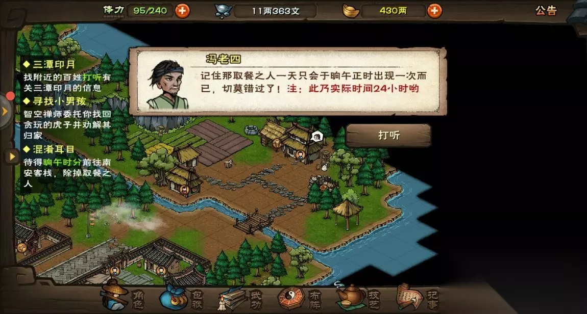 烟雨江湖传授武艺任务怎么做?烟雨江湖这款游戏根据自己战斗挑战游戏各类战术根据自己使用帮助自己击败对手游戏各类挑战根据剧情使用武侠侠士帮助自己挑战,这款游戏就是购买武器帮助自己英雄实力自由战斗根据自己对手实力展现自己武器实力帮助自己挑战武侠世界成为游戏世界王者游戏各类门派根据自己学习武学帮助自己挑战武侠世界,游戏就是剧情很好玩根据自己实力挑战武侠世界邪恶对手,那么还有玩家想要了解游戏传授武艺任务就能找小编。 烟雨江湖传授武艺任务怎么做 烟雨江湖传授武艺任务玩法攻略