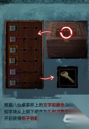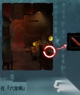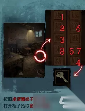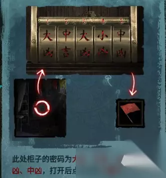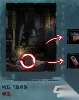 进入【易寿堂】,拾取桌子上的扎纸手机和寺庙,查看书架上的解梦书,里面的内容就是柜子的密码,大凶、中吉、大凶、中凶,依次输入,就能获取物品:小旗子