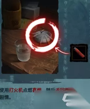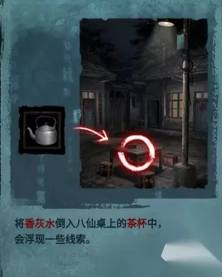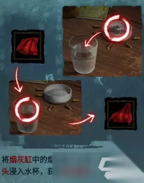 在街道桌子上的烟灰缸和是哪个放上喜纸,使用打火机点燃喜烟,再返回街道继续剧情,将烟灰缸的烟灰倒入水杯,再将红盖头放入水杯,获得物品:浸水盖头