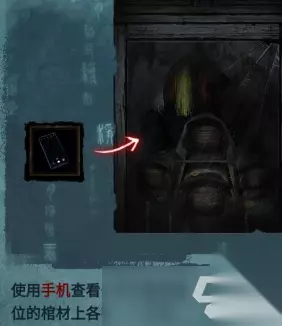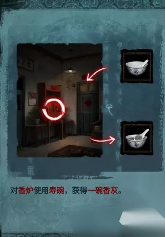 使用浸水盖头擦干净【易寿堂】的窗户玻璃,使用手机查看干净的玻璃,在每个方位的棺材上有一个文字,返回【百年好合】,在桌子上的左侧盒子处,输入刚看到的密码,开启后获得物品:一捆香