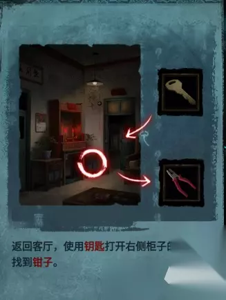 返回客厅,使用钥匙打开右边柜子的锁,获得物品:钳子