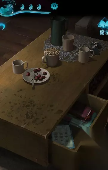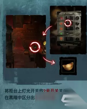 点击收银台的书,里面记载了一些信息 将柜台上的灯光开关的2号开关关闭,就能够在黑暗中分辨发光的元宝,获取物品:元宝