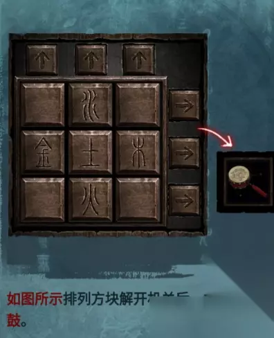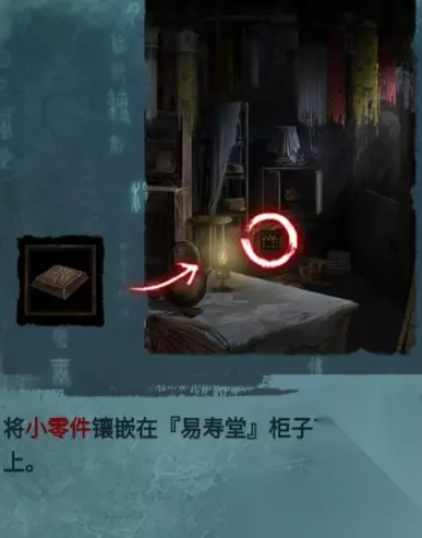将小零件镶嵌在【易寿堂】柜子下方的机关上 如图所示,将方块进行排列解开机关,就能获取物品:拨浪鼓