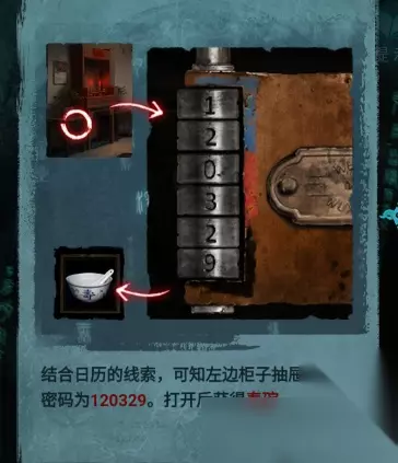 《纸嫁衣3鸳鸯债》第一章攻略 首先就是跟着提示,男主去河边拿到了木板将陷入泥地的车子开出来,这个地方不难,女主那边被水中的新娘抓住了手,场景回到一个小时之前的二爷爷家里,(一开始的二爷爷脾气很暴躁,一直在数落女主,然后女主自己跑出门)此时房间里只有男主一个人。 获得的线索 线索1:墙上的日历(4月的3号红色标记、12号蓝色标记,29号黑色标记) 线索2:神像上的香灰坛子 线索3:神像左边的桌子,有一个抽屉被锁住,锁上需要六位数字(此时男主的提示:二爷爷喜欢用周围能看到的东西当做密码) 线索4:打开神像左边的桌子的柜子,有一个布娃娃(需要取掉螺丝才能打开,也就是我们需要找螺丝刀) 线索5:神像右边的桌子,这里是柜门被锁了,但是抽屉是开的,打开抽屉(空的) 通关步骤: 首先根据日历的数字,得知密码是:120329,打来柜子,获得物品:寿碗