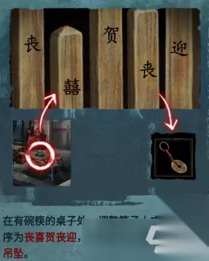 在放着碗筷的桌子出,调整筷子上的文字顺序:丧喜贺丧迎(碗里面的水会消失掉),获得物品:吊坠