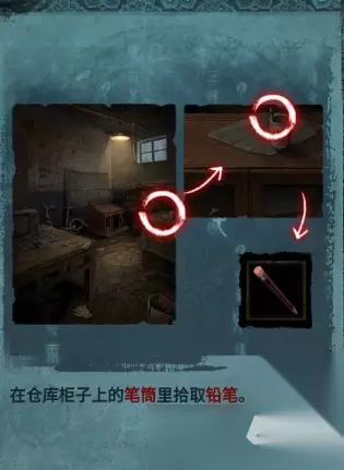 在仓库柜子上的笔筒里,获得物品:铅笔