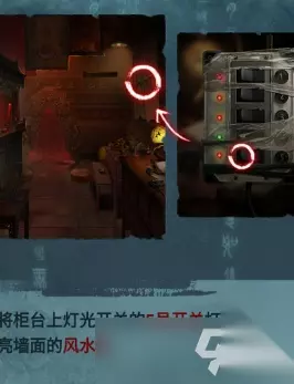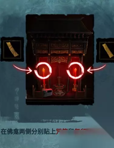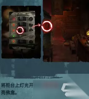将柜台上的灯光开关的3号开关打开,能够照亮佛龛,被照明后,在佛龛的左侧摘下咒符