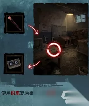 使用铅笔复原桌子上的磁带,获得物品:磁带