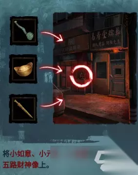将柜台上的灯光开关的5号开关打开,照亮墙面的风水剑,将吊坠放在风水剑上,调整风水剑道下图方向,五路财神画像就会展开,获得物品:小金鞭