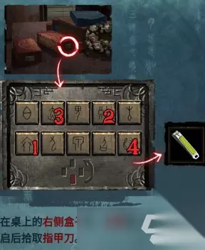 在右侧盒子出,如图输入密码,就能获取物品:指甲刀
