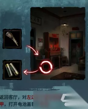 返回客厅,在佛像左边的柜子里面的娃娃,使用铜指甲扣出电池盖,获得物品:电池