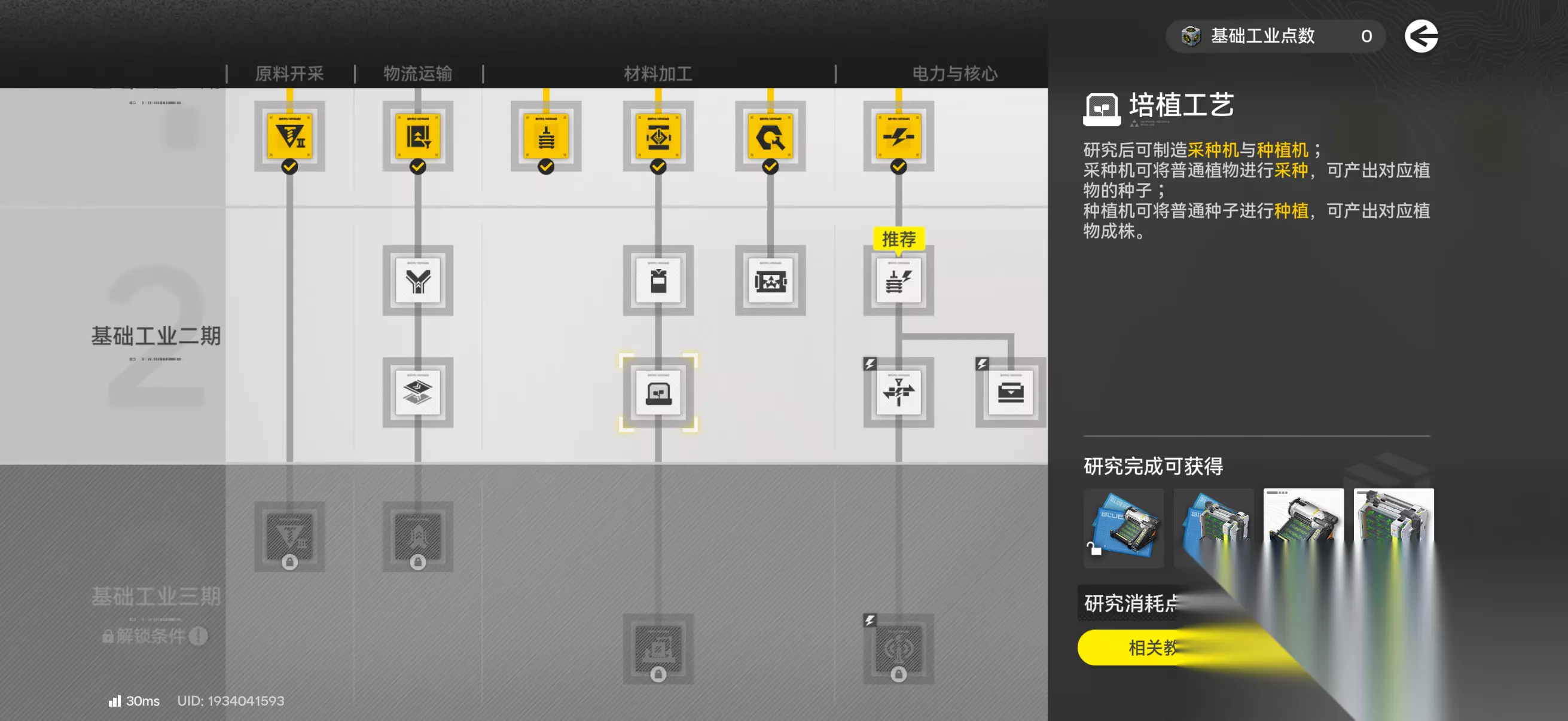在游戏前期只能手动自己采集下载,当玩家开启了工业研究的点数中培育工艺之后,可以在自己的帝江号内开启启动植物的自动生产采集,矿物资源可以用电矿机来开采。当这些架构好之后,还可以利用工业协议搭建出一套完整的集采集、制作、生产一系列流程,节省玩家很多的时间成本。