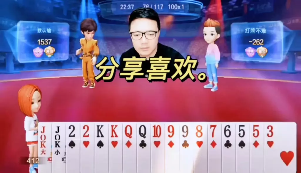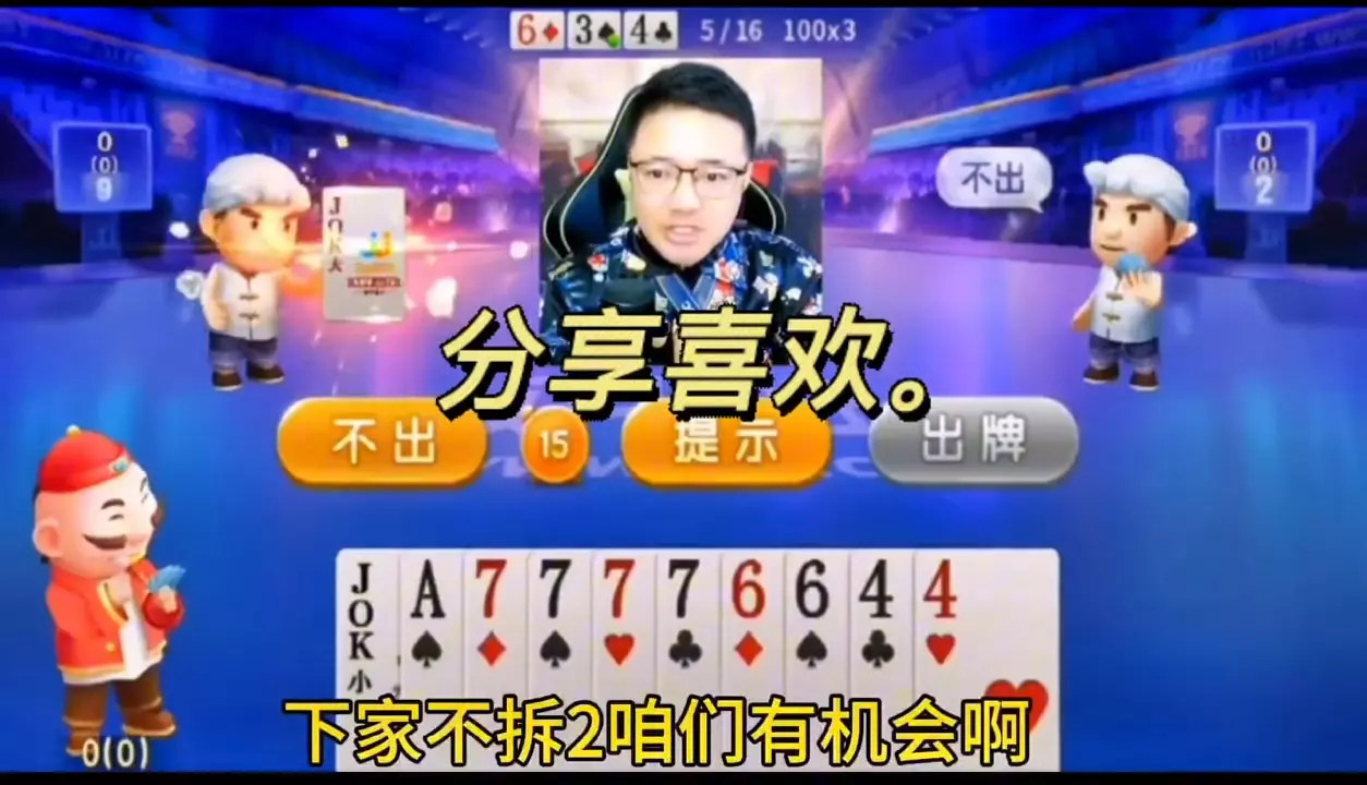 三岁玩牌破釜沉舟四个3的大胆一炸后期残局细腻的行牌为自己争取到了胜利!