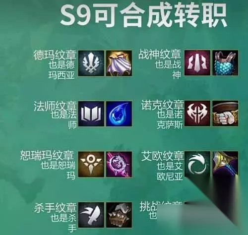 1、艾欧尼亚转职=铲子+大剑; 2、恕瑞玛转职=铲子+大棒; 3、德玛西亚转职=铲子+斗篷; 4、诺克萨斯转职=铲子+腰带; 5、挑战者转职=铲子+攻速; 6、法师转职=铲子+水滴; 7、主宰转职=铲子+锁子甲; 8、裁决战士转职=铲子+拳套; 大家平时在玩游戏的时候肯定也都会遇到各种各样的问题,但是只要是能解决的问题就不是事,那么本次带给大家的云顶之弈转职合成图一览s9最新攻略还是写得比较明显的,不清楚具体应该怎么玩的小伙伴们不要错过。