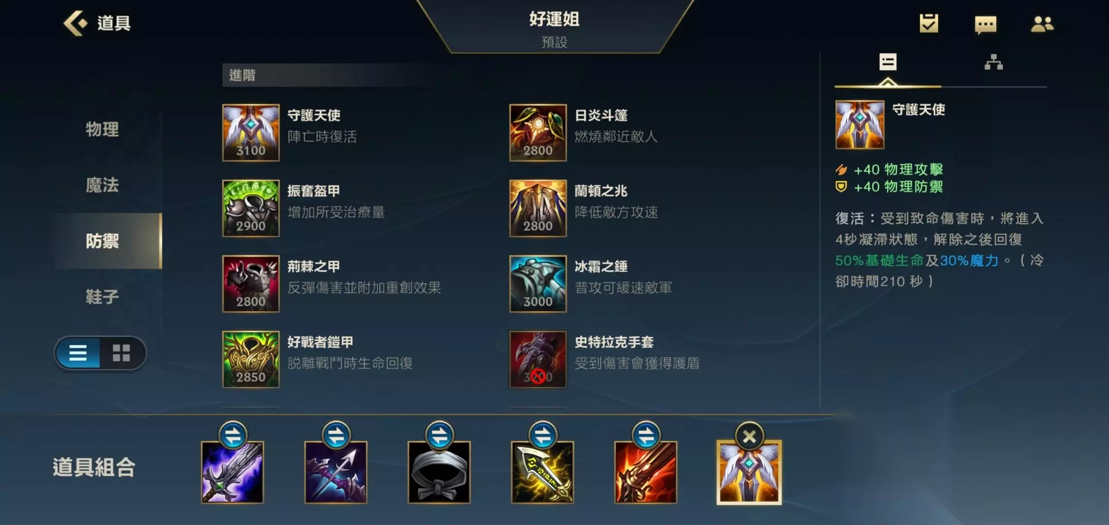 六.复活甲 最后一件装备我们就出复活甲就好了,复活甲可以提供攻击力和护甲值,而且有效的提高自己的打团容错率。