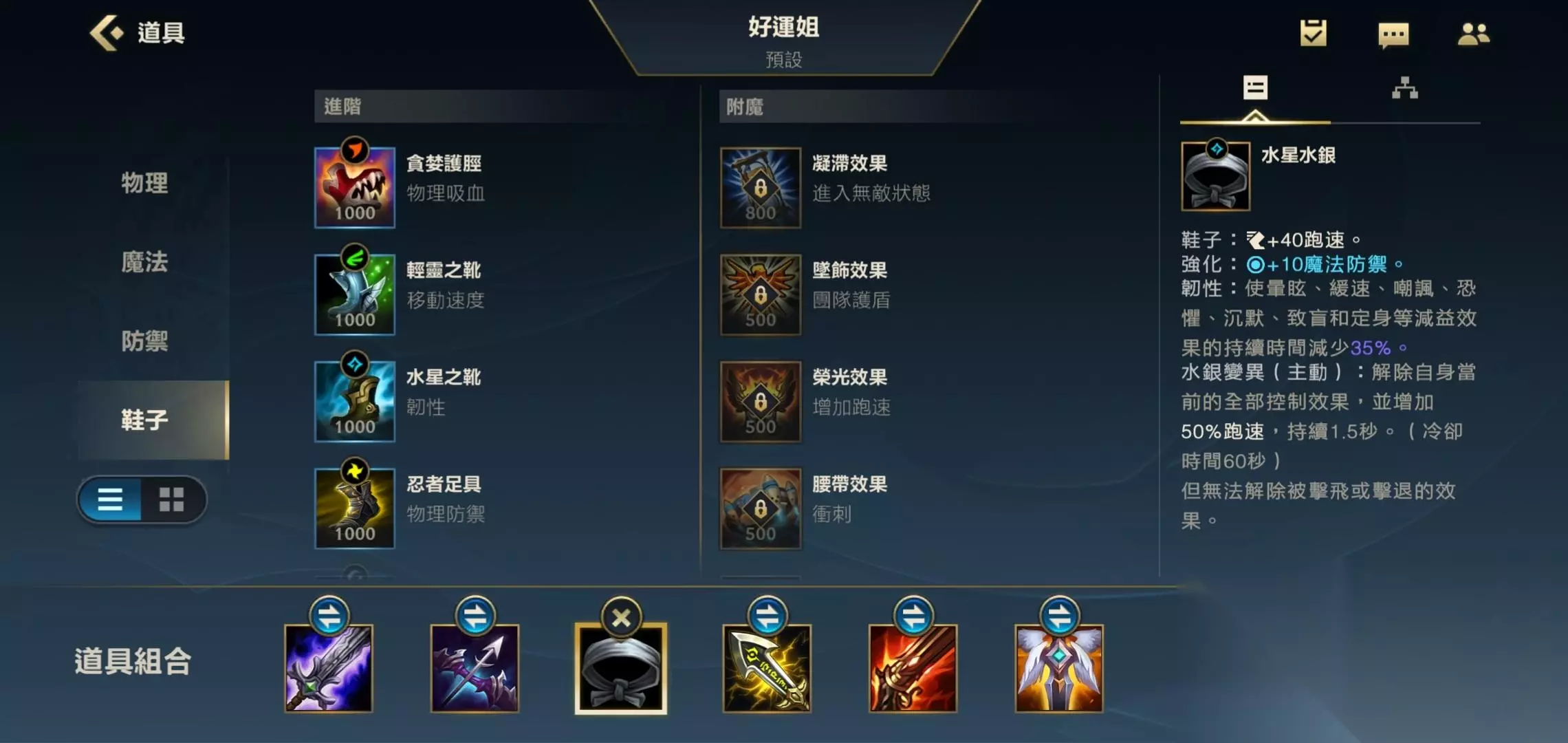 三.水银 第三件装备我们就把水银鞋升级成为水银,之所以出水银鞋是因为水银鞋的效果很强,可以减少自己的被控时间,而且还可以给自己提供魔抗效果,增加自己的坦度,而且升级后的水银可以解控,增加自己的打团容错率。