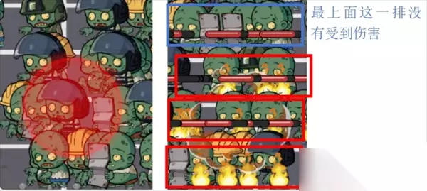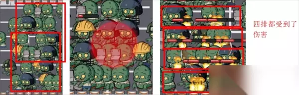 扔燃烧瓶技巧示意图 最好扔在任意四排僵尸中间,这样可以烧到最大面积 否则就只能烧到3排僵尸: