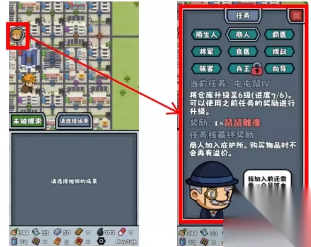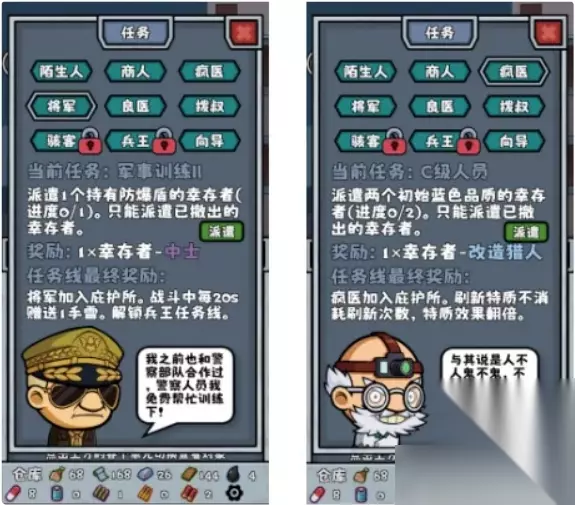 任务示意图 他在你完成特定目标后会奖励你一些物资 (就不用你去专门搜集了,注意看哦!) 这些任务当中要注意“将军”和“疯医”的 他们的任务需要“派遣”,也就是你拿带到避难所的幸存者 (一定是要带到避难所里,即使暂时超出住所上限也没关系,这只影响你是否能再次出发)