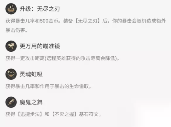 推荐理由 升级无尽之刃:升级无尽提升额外暴击伤害。 更万用的瞄准镜:获得一定攻击距离就不用担心手太短A不到人了。 灵魂虹吸:获得暴击几率同时提升生命偷取。 魔鬼之舞:获得【迅捷步法】和【不灭之握】基石符文。